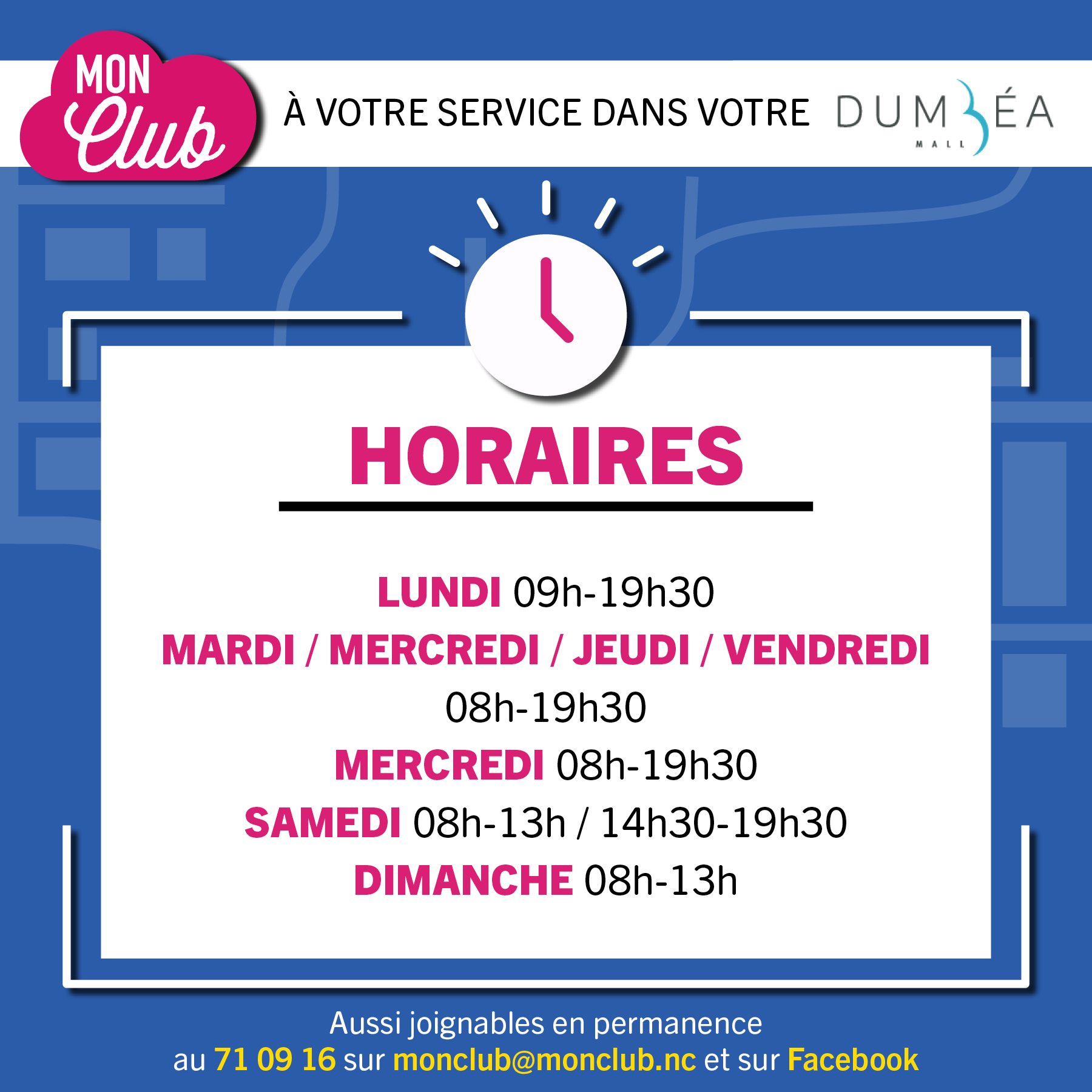 Les équipes de votre application 𝐌𝐨𝐧 𝐂𝐥𝐮𝐛 vous reçoivent cette semaine dans votre 𝐃𝐮𝐦𝐛𝐞́𝐚 𝐌𝐚𝐥𝐥, aux horaires ci-dessous